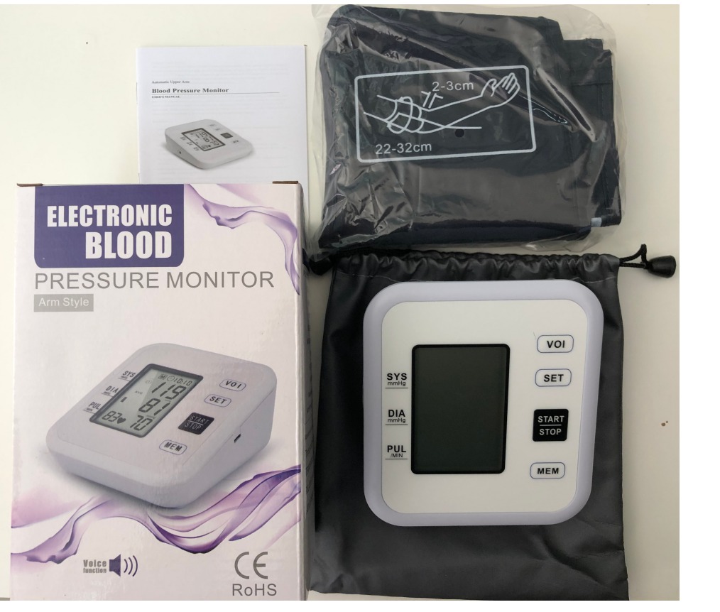 Features: Blood pressure (SYS/DIA) and pulse (PUL) measurement, memory function (MEM), HD English voice broadcast (VOI), and setting (SET) and start/stop (START/STOP) buttons.