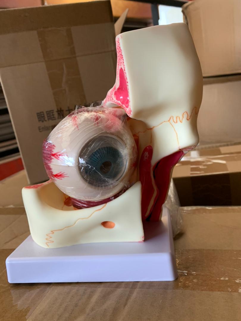 A magnified anatomical model of the human eye and orbit, designed for educational purposes in medical and academic settings.