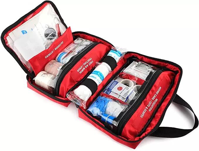 The kit opens to reveal several transparent compartments and pockets, allowing for clear organization of supplies (e.g., “WOUND CARE/CUTS & SCRAPES”, “FRACTURE/SPRAIN”, “FIRST AID MANUAL”, “OUTDOOR/OTHERS”).