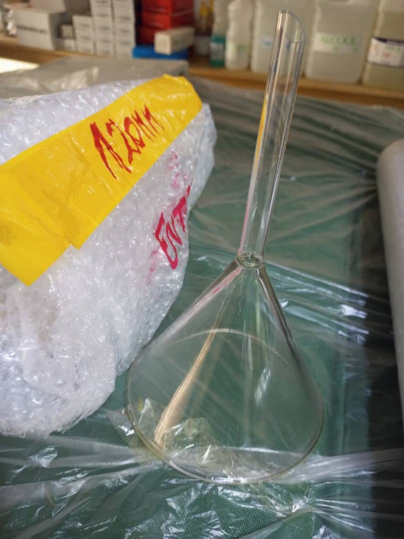 Glass funnels are available in various sizes, namely: 90mm, 120mm, with varying stem diameters and lengths, suitable for various laboratory applications.