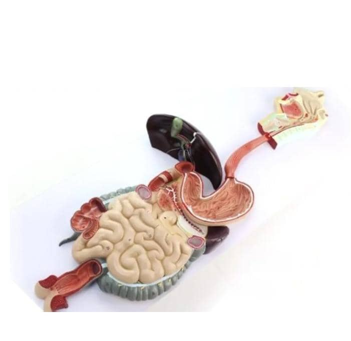 Open and/or Removable Organs: Sections such as the duodenum, cecum, and rectum are open for better internal visualization. Parts such as the transverse colon or the anterior stomach wall are removable for further study.