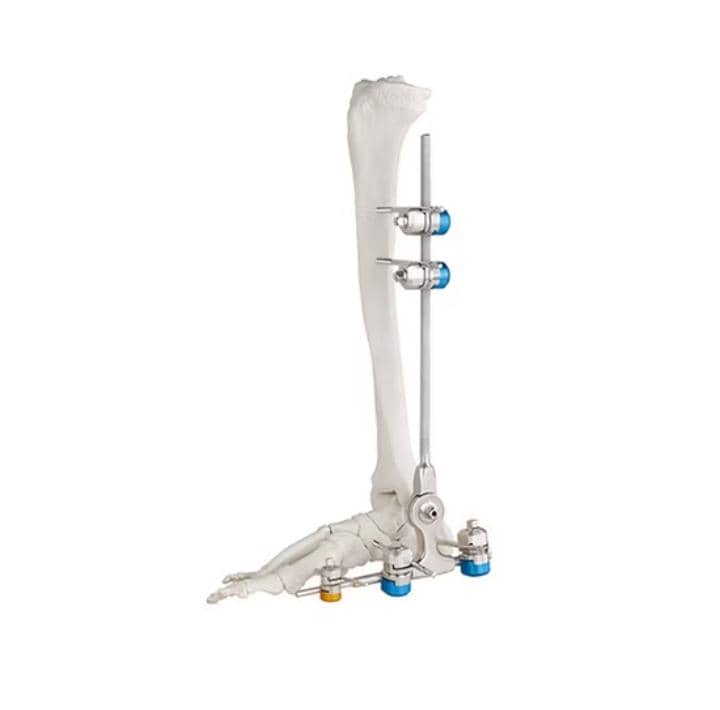 An external fixator, such as the one shown in the leg and foot, is a medical device used to stabilize fractured or deformed bones from outside the body.