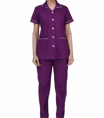 The uniform shown is a dark purple medical scrubs or scrubs for women with white trim.