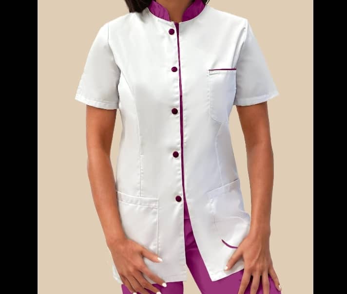 Pockets: The scrubs feature three practical pockets, discreetly accented with piping in the same color as the trim.