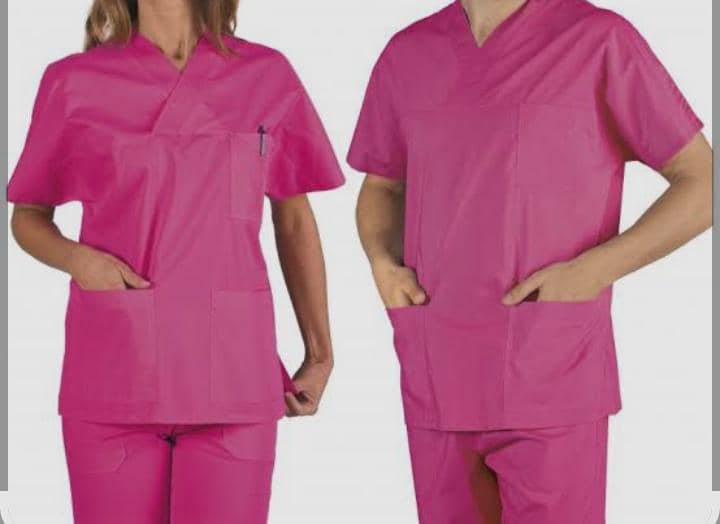 The scrubs shown are a fuchsia pink medical scrubs.