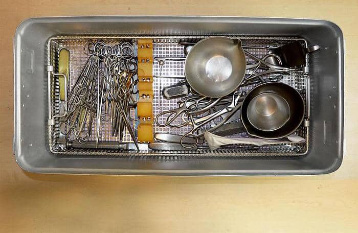 Specialized Contents: It contains an assortment of surgical instruments suitable for procedures on the meniscus (such as meniscus scalpels), knee (retractors, clamps), and foot (clamps, elevators).