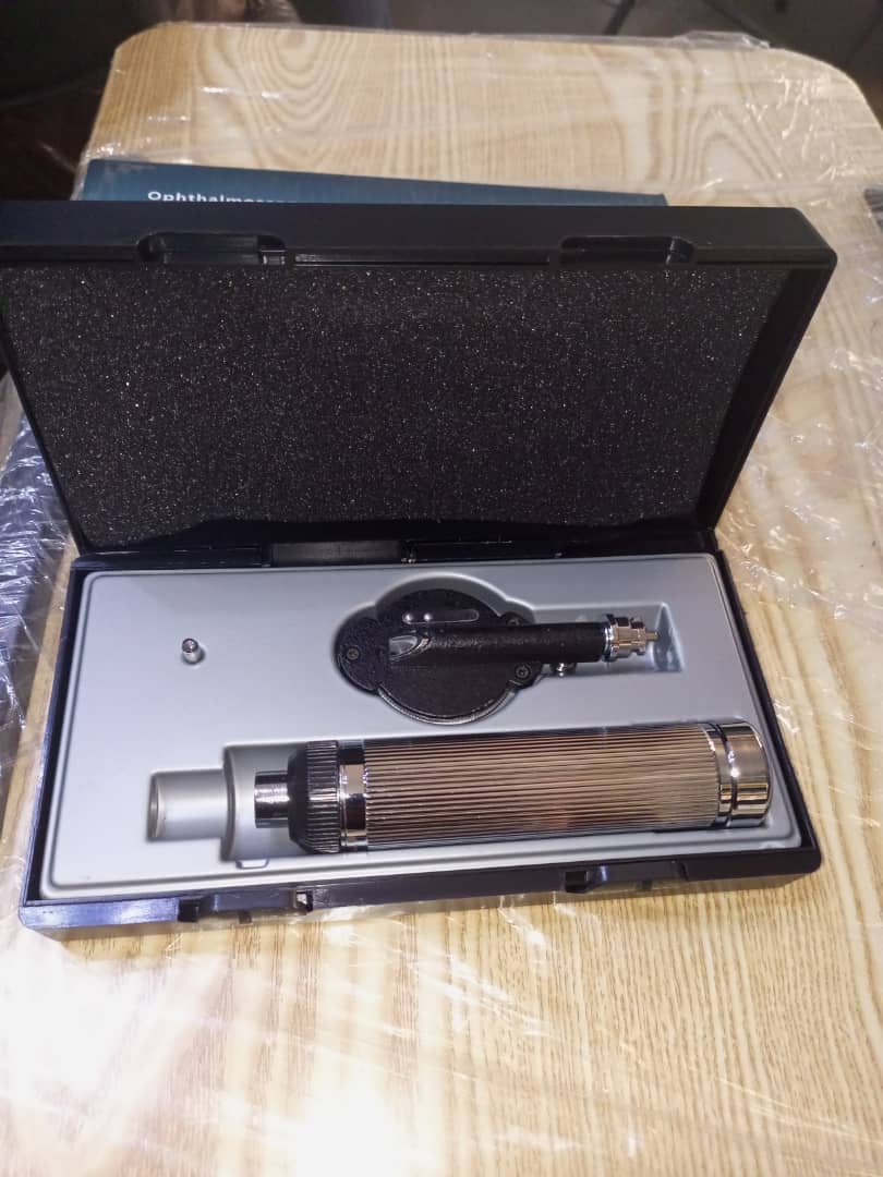 This is a direct optical ophthalmoscope, portable and battery-powered (2 AA batteries).