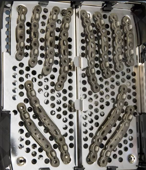 Laterality: Plates are available in “L” (left) and “R” (right) versions, as shown on some of the implants in the image, to accommodate the specific anatomy of the patient’s side.