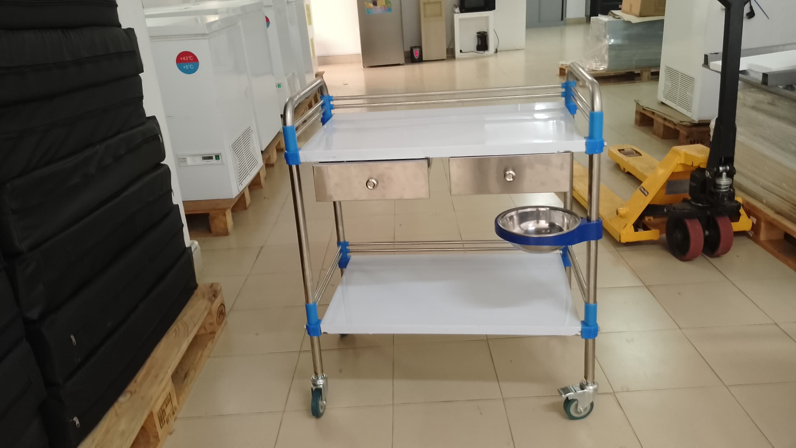 Design: It usually has two or more tiers, with shelves for storage and integrated drawers to secure small instruments or medications.