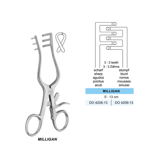 Design: It has two prongs with teeth (sharp or blunt) that mesh to maintain retraction. The size and type of teeth vary depending on the application (for example, smaller ones are for skin and superficial tissues, larger ones for deeper muscles or bones).